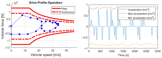 The model for an electric commuter train (ECT) is written in MATLAB. It consists of a set of scripts (m-files) that must be run sequentially. The parameters can be changed to see their effect. For dimensioning the battery, a live script is created so that the effect of changes can be seen directly. A particular feature is a plot that shows the required force against speed, in combination with the maximum (continuous and peak) forces. By mapping the drive profile, it is quickly seen how the drive train performs; see Figure 1.