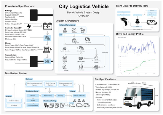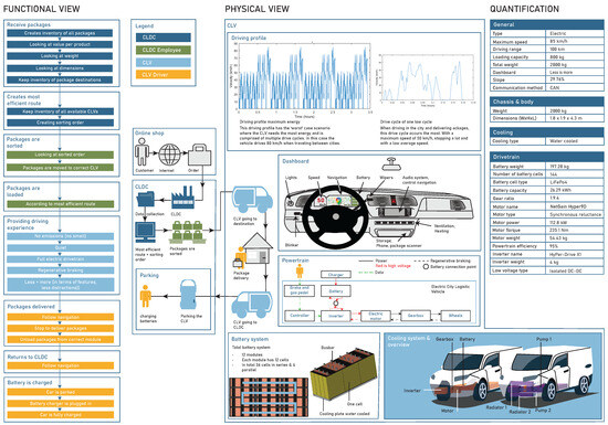 Figure 2 shows an example of an A3AO for a CLV submitted in academic year 2022–2023. On the left side of the A3AO, the functional view shows the steps of the logistics process. These represent the functions occurring at the distribution centre (DC), functions performed by the workers at the DC, and functions of the CLV and its driver. In the centre of the A3AO, as part of the physical view, the components of the envisioned vehicle’s dashboard are depicted, while at the bottom, an overview of the components of the cooling system, the battery system, and a general idea of the envisioned appearance of the vehicle are provided. On the right, the quantification view shows the envisioned key performance parameters. Notably, certain subprocesses (such as online shopping, distribution centre logistics, and parking), as well as driving profiles, have been included in the overview to provide context about possible use scenarios of the vehicle.