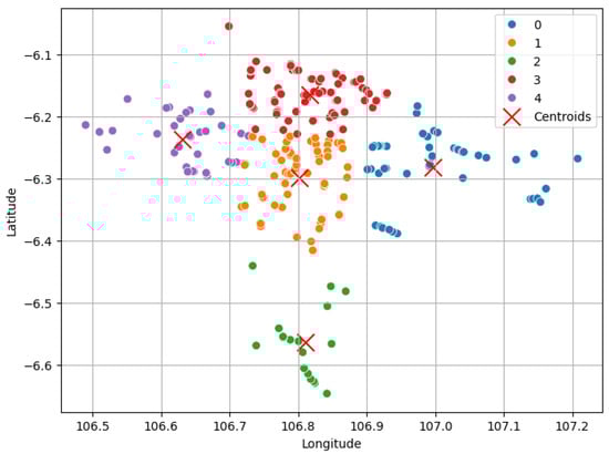 The clustering process leads to two main conclusions: the visualization of clustering results and the identification of candidate logistics facility locations. Utilizing the K-means algorithm, five clusters were successfully formed from the dealer location data, with each cluster represented by the following centroid: Cluster 1 (Orange): Centroid at (−6.29831986, 106.801635); Cluster 2 (Green): Centroid at (−6.5637955, 106.8099795); Cluster 3 (Red): Centroid at (−6.16541688, 106.81689429); Cluster 4 (Purple): Centroid at (−6.236655, 106.63144639); and Cluster 5 (Blue): Centroid at (−6.28131137, 106.99607157).