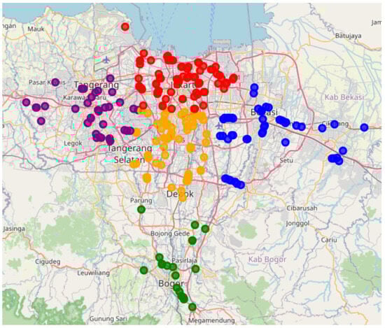 Geographic distribution of clustered EV dealers in Greater Jakarta, with centroid locations marked on the map. The orange dots represent Cluster 1, green dots represent Cluster 2, red dots represent Cluster 3, purple dots represent Cluster 4, and blue dots represent Cluster 5.