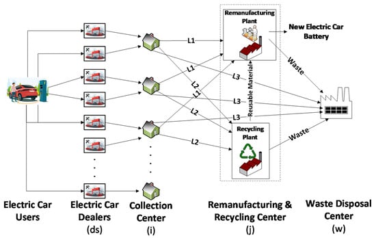 Electric vehicle batteries typically last 8 to 10 years and are often replaced before the vehicle’s lifespan ends, for both performance and safety reasons [5]. EoL batteries still retain 60–80% of their initial capacity, along with high-value metals such as lithium and cobalt [6,7]. If not managed properly, it not only pollutes the environment but also causes economic losses. Therefore, managing EoL batteries through reuse, recycling, or remanufacturing is crucial to supporting a circular economy and reducing dependence on primary raw materials [8,9]. One strategic approach is to handle this by establishing a reverse logistics network (RLN), a system designed to manage the return of products from consumers to producers for value recovery [10]. Effective RLN design will help reduce costs while considering social and environmental factors [11,12].
