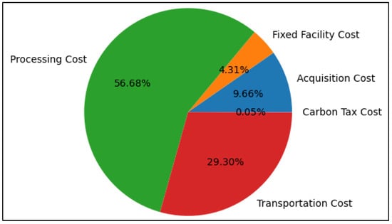 Although emission minimization was not explicitly included in the optimization objective, a post-optimization emission analysis revealed that processing activities contributed approximately 91.8% of the total emissions (21,108,271 kg CO2), while transportation accounted for only 8.2%. This finding highlights the significant role of technological and energy efficiency in processing operations, which reduces the environmental impact and potential carbon tax liabilities.