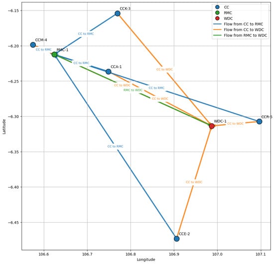 The strategy of centralizing processing and disposal also proved effective, where only one RMC (RMC-1 in Tangerang) and one WDC (WDC-1 in Bantar Gebang) were selected. The location of RMC-1, which is centrally situated near several CCs, facilitates efficient battery flow, while WDC-1, as a regional disposal site, provides operational and policy advantages. In terms of volume, the most significant flow originates from i (West Jakarta), followed by CCA-1 (South Jakarta), reflecting the high number of dealers and potential supply of EoL batteries in these two regions.