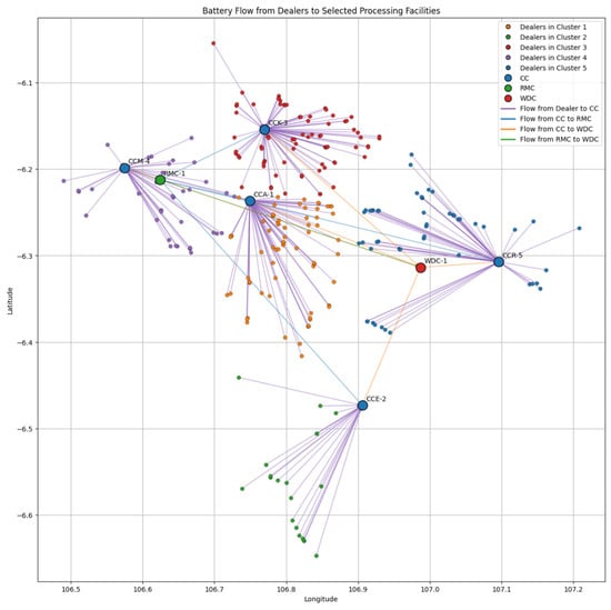Figure 6 presents a visualization of the overall flow of EoL electric car batteries in the designed RLN. The flow starts from the dealers within each cluster, moves to the collection center in that cluster, and then continues to the selected processing facility that has been optimized using the MILP model. Each dealer in the cluster is visualized with a different color: orange for cluster 1, green for cluster 2, red for cluster 3, purple for cluster 4, and blue for cluster 5, while the flow path from the dealer to the CC is shown in purple. The flow directions between processing facilities are depicted using different colored arrows to clarify the logistics routes in the RLN.