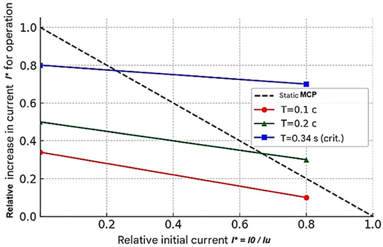 s, red) and lies well below the standard static MCP (black dashed line) setpoint. As the time constant increases to the critical value of T (for this circuit breaker,