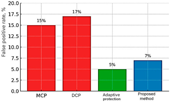 Figure 8 shows histograms of false tripping frequencies for different protection methods. It can be seen that traditional overcurrent protection (MCP) at low CS currents has a high percentage of false alarms (up to ~15%, red bar), and current differential protection (DCP) at a line length of >2 km can produce up to 17–18% false tripping due to electromagnetic interference and current asynchrony at the ends of the line. Adaptive digital security systems exhibit lower false alarm rates (<5%, green bar) due to constant setpoint tuning, but are costly and complex to implement. The method proposed in the paper (blue column) made it possible to reduce the share of false outages to 7%, that is, more than twice compared to traditional solutions. This indicator was obtained in real operating conditions after setting up the protection according to the new method, which confirms its effectiveness. A significant reduction in the number of erroneous alarms means that the protection selectively disables only the damaged area, practically not affecting adjacent areas in non-standard modes, which was previously a serious problem.