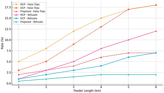 Comparison of false trip and refusal rates versus feeder length for MCP, DCP, and the proposed impulse protection method. The proposed method demonstrates lower failure metrics, especially for feeder lengths over 3 km.