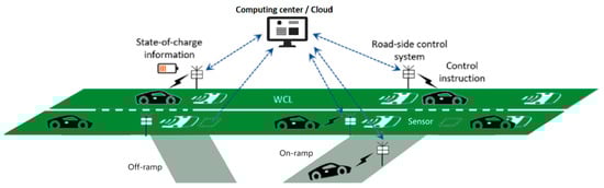 - EVs are charged for the entire duration of driving on the WCL, with the amount of energy charged proportional to the time spent in the WCL []. This is reasonable since the DWPT facility is normally evenly distributed along the WCL, and the energy replenished is commonly assumed to be proportional to the recharging time []. Furthermore, the energy received by EVs is only related to the power received by its secondary coil from the primary coil embedded in the WCL and the time duration of energy transmission by the DWPT system [].