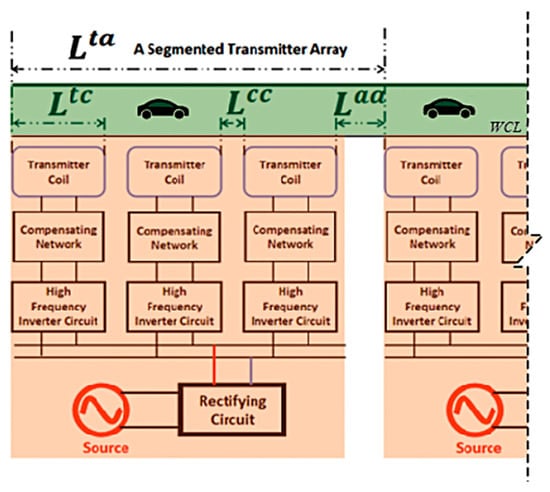 Wireless power transmission aims to charge the EV’s battery to increase range and to maximise the total electrical energy received from the DWPT system by EVs travelling on the WCL. Figure 2 illustrates the DWPT charging system with a segmented transmitter array considered in this model as a “combination scheme” [], in which multiple consecutive coils are connected to one power source, forming a power transfer segment. This configuration type combines the main advantages of other types of segmented DWPT systems: (1) segmenting the power supply to the array to reduce the power loss of the system; (2) reduced coil self-inductance and sensitivity of the system to the change in coil parameters, leading to improved stability; and (3) low maintenance costs. Furthermore, this type is suitable for large-scale applications [].