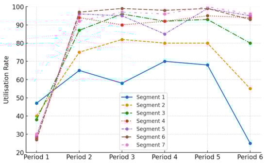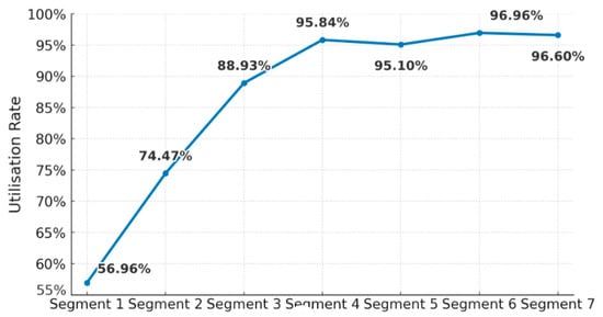 Figure 4 gives the WCL occupancy rate for each segment, which can be obtained by comparing the actual traffic flow and the carrying capacity of the segment during the same period. It can be concluded that: (1) For segments 1~3, the rate of WCL use is significantly lower in periods 1 and 6 than in other periods, due to insufficient traffic volumes at the beginning of the expressway operation and during off-peak periods; (2) For segments 4~7, they all achieve rates of over 85% when the expressway is in steady operation (i.e., periods 2~6) and even approach 100% for several periods, demonstrating that our solutions make full use of the WCL. To further obtain the actual utilization rate of WCL in each segment, the mean values of periods 2~5 (representing stable operation) are compared, as shown in Figure 5. We can see that the rate steadily increases from less than 60% in segment 1 to nearly 90% in segment 3 and remains above 95% in segments 4~7.