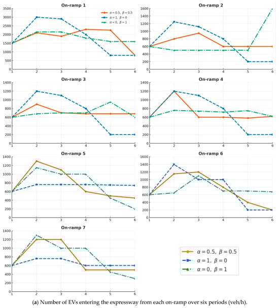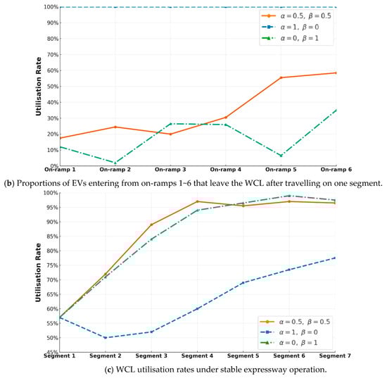 Figure 6 further compares the results of the three models. Specifically, Figure 6a,b focus on comparing the on-ramp traffic inputs, while Figure 6c compares the WCL utilisation rates under steady operation. We can see from Figure 6a that when , the vehicle input curve at each on-ramp is similar to the demand curve, meeting close to 90% of the demand even during peak hours, which is achieved by the traffic control system issuing commands to all EVs with a high initial SOC to switch to the GL at the first opportunity. Although this allows more EVs to be served in time, it is unacceptable for all EVs with a high initial SOC to receive energy only on the segment where they enter. When , the vehicle input curve has little fluctuation between periods 1~5, which can lead to a polarisation of service. For the EVs whose needs are first responded to, they enjoy a significant amount of charging time without facing queuing times, whereas other EVs need to suffer excessive queuing times consequently. While the vehicle input curve of the WCL traffic control model lies mostly between the above two models, it remedies their respective limitations. Figure 6c shows that when , the WCL utilisation rate for segments 2~7 is markedly lower than the other two scenarios, which is also consistent with the conclusion drawn in Figure 6b. Moreover, the usage rates for each segment under the WCL traffic control model are slightly different from the optimal solution when only energy charging is optimized, even higher in segments 2~4, reflecting nearly no loss of trade-offs in the charging part. Overall, the proposed WCL traffic control model with trade-offs and performs well in terms of both traffic and energy services, particularly giving a near-optimal solution in the energy part.