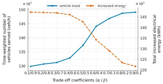 To further explore the impact of the trade-offs (i.e., values of and ) on the developed model, we set and to one decimal place between 0.1 and 0.9, resulting in eight new schemes for comparison. Table 8 gives the values of the two components in the objective function of the optimal planning solutions for nine cases of trade-offs, including the basic case , all of which achieve a better balance between the two parts of the objective function compared to the extreme case, even in the scenarios with and . Figure 7 plots the two components’ values over difference trade-offs, which indicates that the time-weighted number of vehicles served is negatively correlated with the amount of electricity received by all EVs, and the relationship between the two can be divided into three phases: (1) Both curves remain relatively stable when takes values of 0.1/0.9, 0.2/0.8 and 0.3/0.7; (2) Both curves have a clear increasing/decreasing trend when takes values of 0.4/0.6, 0.5/0.5 and 0.6/0.4; and (3) the increasing of the vehicle input curve is significantly slower than the decreasing of the increased energy curve when takes values of 0.7/0.3, 0.8/0.2 and 0.9/0.1. In other words, the trade-offs have little impact on the model when and , while the trade-offs hurt the model when and , which can also be confirmed by Table 8 that compares the model solutions to the best possible one in terms of the value of the single component achieved by or . In summary, the trade-offs and for the developed WCL traffic control model are recommended to be between 0.3 and 0.7 in this example.