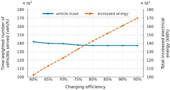 The charging efficiency is set to 80% in this example, which in theory can reach over 90%. The increase in charging efficiency will enable all EVs to get more electrical energy on the expressway; however, the magnitude of this improvement in terms of the electrical energy received by EVs and its effect on the vehicle traffic input is unknown. If the charging efficiency improvement has an excessive negative influence on the vehicle input, a lower charging efficiency on the WCLs would be a more balanced option. To study the specific impacts of increased/decreased charging efficiency on the above unknown scenarios, seven additional efficiency values (i.e., 60%, 65%, 70%, 75%, 85%, 90%, and 95%) are selected for comparison with the current 80% efficiency value.