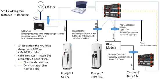 The measurement setup is illustrated in Figure 1, which shows the electrical connections between the PCC, the BESS, and the three downstream chargers. Cable lengths and conductor cross-sections are indicated in the figure for transparency and reproducibility (e.g., 75 m between BESS and Charger 3, using 4 × 240 mm2 cable). Measurements were conducted at both the input and output of the BESS using waveform recorders (SIRIUS, manufactured by DEWESoft, Trbovlje, Slovenia).
