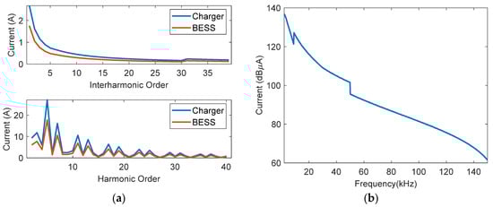 Derived current emission limits based on Monte Carlo analysis considering system impedance and charger ratings: (a) emission limits across harmonic and interharmonic orders for the charger and BESS at the PCC; and (b) supraharmonic emission limit curve (10 kHz–150 kHz) derived from statistical assessment of system constraints.
