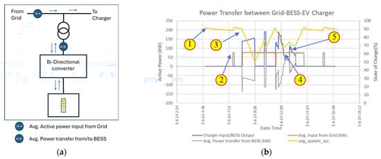 (a) Single-line representation of BESS module used in peak shaving mode for Mode 4 EV charging. (b) Power transfer between BESS and Mode 4 EV charger and between LV grid and BESS module. Numbers indicate the significant transitions in the operation of the BESS and charger modules.