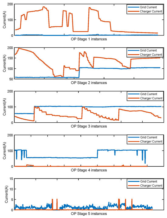 To evaluate the waveform distortion introduced by the BESS and charger modules during the various operating stages identified in Section 3, this section presents the recorded interharmonic, harmonic, and supraharmonic emissions corresponding to each mode of operation. For harmonic and interharmonic current emissions, and in accordance with the methodology specified in IEC 61000-3-2 [27], the arithmetic mean of the emissions observed during each operating stage is calculated and compared against the respective emission limits derived in Section 2.1. For harmonic voltage emissions up to 2 kHz, root mean square (RMS) values are computed over a three-second aggregation window, and the 99th percentile of these values is compared against the short-time compatibility limits specified in IEC 61000-2-2 [25]. A similar approach is adopted for interharmonic voltage emissions, wherein the three-second aggregated RMS values are benchmarked against the compatibility limit of the next higher even-order harmonic, as recommended by the standard. To aid in the interpretation of the emission behavior, the variation in the fundamental current across operating stages is presented in Figure 4, providing context for the observed emission patterns under different loading conditions.