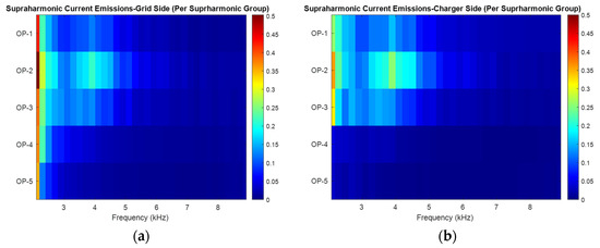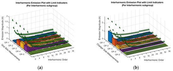 The steady-state BESS-only operation (OP4) involves the BESS supplying the charger with minimal dynamic interaction. Here, the emissions primarily reflect the steady-state switching of the converter (primary emissions), with secondary emissions arising from the grid-induced voltage distortion. The harmonic levels are more stable, and the interharmonic content is lower than in OP2–OP3 due to the absence of fast load ramps.