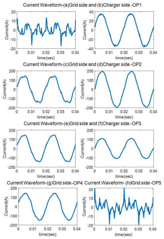 The AC-side current controller of the AFE is generally 5–10 times faster than the voltage controller [40,41,42], requiring a response time in the range of 2–8 ms, or a bandwidth of approximately 20–80 Hz. Typically, the bandwidth of the current controllers, as identified in the literature [30,37,40,41], is greater than 100 Hz. This implies that, for a fundamental frequency of 50 Hz, every transient event, such as a sudden change in active power requested by an EV, leads to a change in the amplitude of the current waveform within a single cycle. These abrupt variations introduce waveform asymmetry, resulting in differences between the positive and negative half-cycles of the current. Such asymmetries are a known cause of even-order harmonics and interharmonics, especially during dynamic events in EV charging. The nature of these transient emissions is strongly influenced by the charging profile selected by the EV or battery manufacturer. This includes factors such as the following: