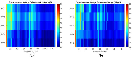 In the supraharmonic frequency range (2–9 kHz), the maximum RMS values of the measured supraharmonic voltages and currents are identified for each operating stage. For the 9–150 kHz range, the assessment is carried out using the light quasi-peak (QP) method described in [28]. The recorded waveforms are post-processed to compute quasi-peak emission levels, whose RMS values are then compared against the compatibility limits defined in IEC 61000-2-2 [25] for voltage, and against the supraharmonic current emission limits established in Section 2.1. Since measurements are conducted across all three phases, the maximum value among the phases is reported for each frequency group.