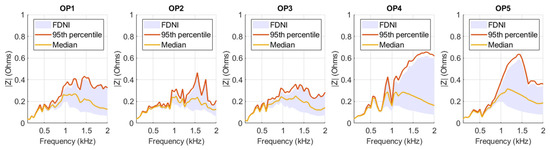 Regarding the supraharmonic emission, the study observed intermodulation components and variable voltage distortion, which are linked to the load impedance and switching behavior of power converters. As shown in Figure 16, the 11 kHz distortion component decreases upon EV charger activation, likely due to a reduction in effective load impedance and the localization of supraharmonic currents. However, converter switching may also introduce resonant behavior, leading to an elevated voltage distortion at other frequencies. Evidence of such resonances was observed in the measurements and may explain the presence of components outside the expected intermodulation frequency range. Further research is needed to better understand the influence of fast chargers and BESS modules on the FDNI and associated resonant conditions.