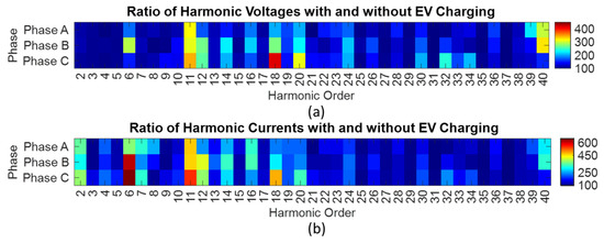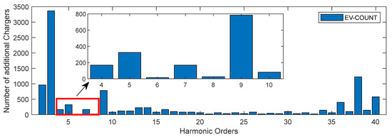 The total harmonic voltage distortion at the PCC is modeled as the sum of the distortion present without EV charging and the additional distortion caused by the EV/BESS harmonic currents and the currents of the miscellaneous loads passing through the frequency-dependent network impedance (FDNI), as described in Equation (5). Under the limiting condition where the total voltage distortion equals the threshold specified by the 10 min IEC 61000-2-2, the maximum number of chargers that can be connected without violating harmonic limits is computed using Equation (6).
