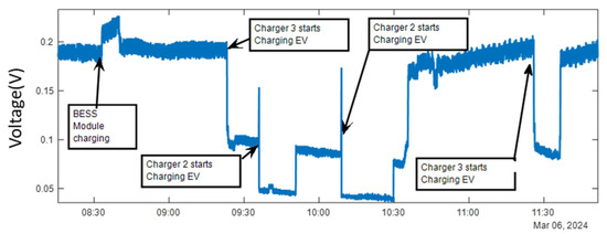 The BESS module, comprising a battery pack and a bidirectional power converter (which includes both AC–DC and DC–DC stages), supplies AC power to Charger 3 (a Mode 4 charger rated at 180 kW). This configuration is shown in Figure 1. The BESS regulates power flow to ensure Charger 3 receives its required input without external conversion hardware. Charger 2, also rated at 180 kW but operating independently of the BESS, was monitored at its input using a separate DEWEsoft recorder. A third charger, Charger 1, with a maximum output power of 54 kW, was also connected downstream of the PCC. However, it was not instrumented during the measurement campaign.