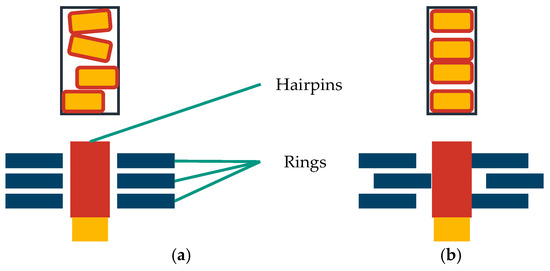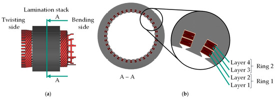 (a) Typical hairpin stator design; (b) Section view showing the different layers and rings.