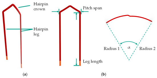 The typical shape of a hairpin is shown in Figure 3. Important geometric properties to describe the shape of a hairpin are its leg length and pitch span. Furthermore, the radius of both legs and the angle between them can be used to describe the shape, which is particularly important for the gripper design in the pre-assembly process. The three-dimensional, complex shape of the hairpin crown will not be discussed in detail here, as hairpins are usually gripped by the legs.