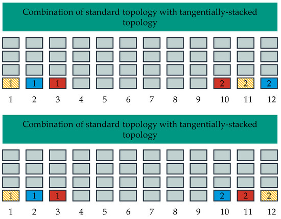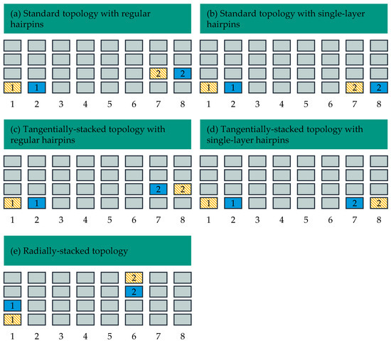In addition to the shape respectively the geometric properties of an individual hairpin and its assignment to one of the hairpin types mentioned above, its location in relation to its neighbors is important for the pre-assembly process. This arrangement of two or more hairpins is referred to as topology in the following. To illustrate the topology of hairpins more clearly, the stator is mentally unwound as shown in Figure 4. The examples show a stator section with four layers and eight slots. The positions of the first and second legs of the hairpins in the stator are color-coded. Figure 4a,b show the most common topology, which is why it is referred to below as the standard topology. Here, both hairpins have the same span. Accordingly, both legs of the second hairpin are offset by one slot from those of the first hairpin. In the case of the standard topology combined with regular hairpins, the legs are in adjacent layers; in the case of single-layer hairpins, they are in the same layer. It is clear from this illustration that the standard topology with regular hairpins can be used to form an entire hairpin ring with—in the case of a stator with 36 slots—36 hairpins. This is not possible with single-layer hairpins because the second legs occupy the slots of the same layer. In the example shown, no further hairpin could be inserted in slot 7, as this slot is already occupied by the second leg of the hairpin with its first leg inserted in slot 1. For this reason, the standard topology with single-layer hairpins is only used for a certain number of hairpins, referred to below as a hairpin group. Such a hairpin group often consists of two or three hairpins, for example. Another common topology is the tangentially-stacked topology shown in Figure 4c,d. Again, it can consist of regular hairpins (c) or single-layer hairpins (d). In this case, both legs of one or more hairpins lie tangentially between the legs of an outer hairpin. The tangentially-stacked topology with regular hairpins is an example for two regular hairpins with different shapes within one hairpin ring. Finally, the radially-stacked topology is introduced in Figure 4e, which describes the position of two radially adjacent hairpins. Here, both legs of one or more hairpins lie radially between the legs of an outer hairpin. According to the hairpin types introduced above, this topology is only possible with special hairpins whose legs are in non-adjacent layers.