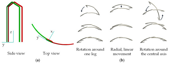 The hairpin types and topologies described in Section 2.3 generally result in mutually overlapping hairpins. For example, the standard topology with regular hairpins results in the overlapping shown in Figure 6a. It can be seen that the legs of the first hairpin lie above and below one leg of the second hairpin. This results in the problem that the hairpins cannot be pre-assembled purely axially in z-direction. Possible movements that allow the collision-free pre-assembly of two regular hairpins in theory are shown in Figure 6b, although no auxiliary devices that could further restrict the possible movements are yet included in these considerations. In practice, it is almost impossible to insert all hairpins directly into the lamination stack automatically, as the joining gap in the slot is too small to perform the required movement of the hairpin. Even though direct insertion by manual assembly may be possible by carefully bending already assembled hairpins to the side in order to assemble further hairpins, it is common practice to first pre-assemble the hairpins in an auxiliary device, both manually and automatically. Even in this case, however, it is essential to adhere to a winding design-specific assembly sequence that allows collision-free assembly.