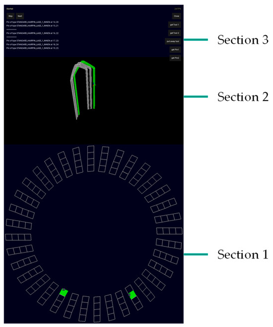 Visual support for the operator is provided by three sections with different illustrations, see Figure 10. The basis of the collaborative assembly is the bottom section (Section 1), which shows the correct slot and position of both legs of the hairpin to be assembled in color. The assembly device is in the centre of the illustration. By pressing the space bar on the connected keyboard, the display is updated to show the correct position for the hairpin to be placed and the vacuum is switched off so that the hairpin can be easily removed from the gripper. During the assembly process by the worker, the cobot fetches the next hairpin for assembly. In section two, there is a 3D-representation of the hairpin basket that has been set up to that point. The hairpin currently to be set is highlighted in color. The 3D-model can be rotated and zoomed in using a mouse if required. The third section contains a list of the last three hairpins set, the current hairpin and the next three hairpins.