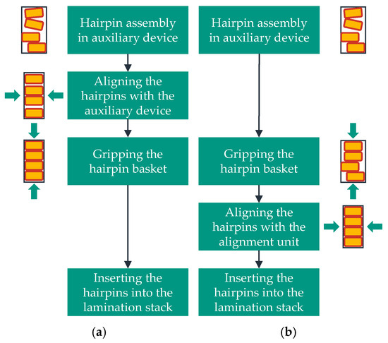 Two concepts for gripping and aligning hairpin baskets with exclusively radial clamping: (a) Aligning the hairpins with the auxiliary device; (b) Aligning the hairpins with an alignment unit.