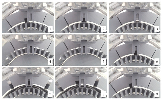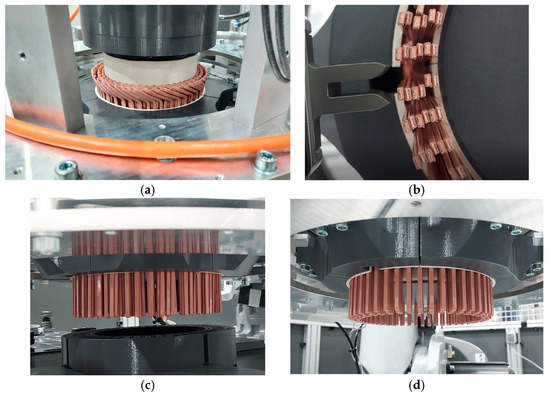 The new approach for gripping hairpin baskets and aligning the hairpins in a sequential process was tested using a stator with 48 slots and 6 layers. Even though the concept works in principle, it still has some issues to deal with. Especially if the hairpin basket has a lot of play in the assembly device, the initial position of the hairpins in the basket gripper is already so poor that sequential alignment is hardly possible, see Figure 17a–c. Nevertheless, the hairpin basket is gripped securely even in this case and the hairpins do not move axially. If the play in the assembly device is reduced, the initial position of the hairpin legs is also significantly better (see Figure 17d) and they can be moved securely into the alignment unit. For this reason, it is conceivable to combine an auxiliary device that can align the hairpins tangentially (Figure 12a) with a gripper consisting of only one gripping unit with 6 gripper jaws. Sequential alignment would not be necessary in this case.
