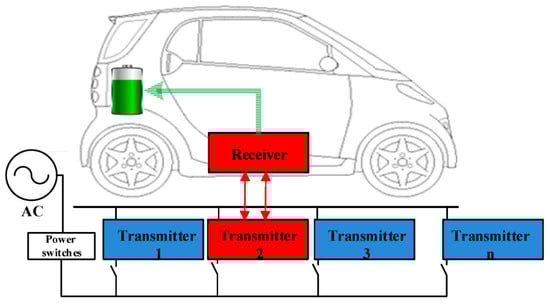 As shown in Figure 5, the coupling coefficient between the receiver coil and each of the individual transmitter coils changes as a function of the vehicle’s position on the road. Based on this observation and the equivalent diagram of the DWPT system, we realize that to improve the efficiency of energy transfer, it is preferable to power each transmitter coil independently only when the vehicle is overhead. This allows energy to be concentrated where it is really needed, avoiding losses associated with the simultaneous activation of several coils.
