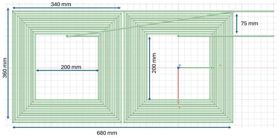 The central air gap (200 mm × 200 mm) enables maximum diffusion of the magnetic field directly beneath the vehicle, ensuring better coupling even in the case of lateral or longitudinal misalignments. The total width of the DD coil is 680 mm, including both side coils and spacing. This geometry resembles and is based on other industry-driven configurations but designed specifically to address the problem of reducing coupling between adjacent transmitting units a significant drawback of standard rectangular or circular coils for applications in dynamic environments [].