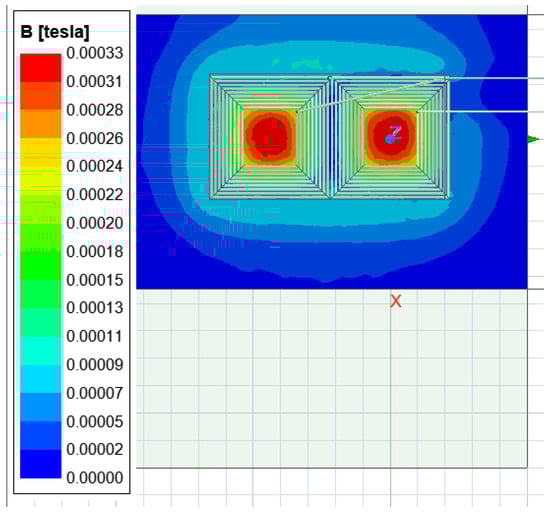 This configuration provides a robust and realistic model for studying magnetic field performance and coil design optimization. It also forms the foundation for more advanced models involving shielding media, dynamic alignment tracking, and system-level calibration. The field gradually recedes as it moves away from the center of the coils, as demonstrated by the change from red to blue [] (see Figure 4). This field symmetry results in an effective transfer zone despite the vehicle’s displacement. This configuration demonstrates the effectiveness of DD design for safe dynamic energy transfer.