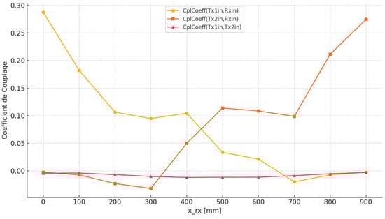 The CplCoeff (Tx1in, Rxin) curve is maximal at the central position x_rx = 0, with a value of around 0.29, and then decreases continuously. This proves that coil Tx1 is perfectly aligned with receiver Rx when in position x_rx = 0. In contrast, the CplCoeff (Tx2in, Rxin) curve starts loosely coupled but rises steadily, reaching approximately 0.275 when x_rx = 900 mm, at which point coil Tx1 is aligned with Rx. This is a good illustration of the complementary role of Tx2, which becomes active when the receiver moves laterally away from the Tx1 coil.