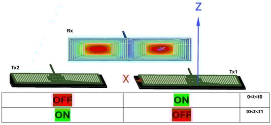 Undefined power as long as coil Rx is aligned with Tx1 at time t = 0 until t0, when Rx is between Tx1 and Tx2, Relay 1 is closed (Tx1 is powered), and Relay 2 remains open. As soon as Rx passes Tx1 to approach Tx2, i.e., time t0, the command reverses: Relay 1 opens, and Relay 2 closes to power Tx2 (see Figure 6).