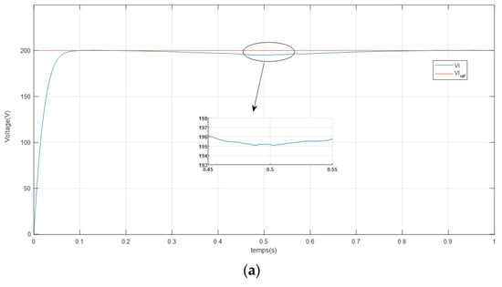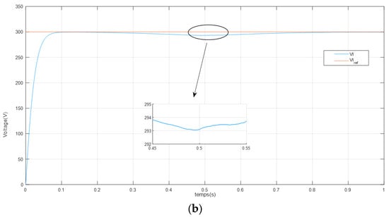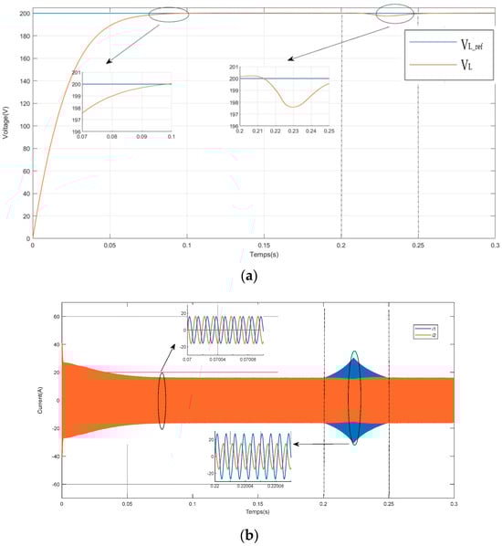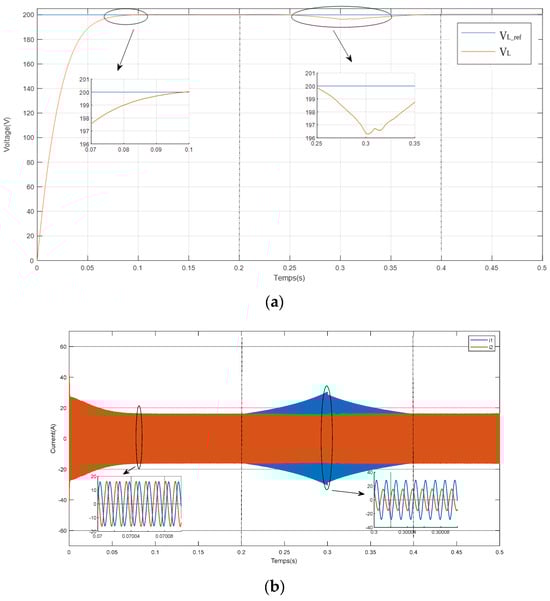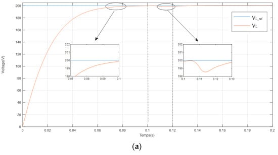Figure 12a,b show the comparison between output voltage VL and its reference VL_ref for a given input scenario. A rapid rise in output voltage is observed, reaching the set point in around 0.07 s, followed by a quasi-stationary regime. A slight deviation appears around t = 0.5 s, highlighted by a localized zoom, showing a ripple of less than 2.5% of the reference voltage value VL_ref. This low variation testifies to excellent stability and precise tracking of the setpoint, despite the presence of misalignment at the receiver coil.