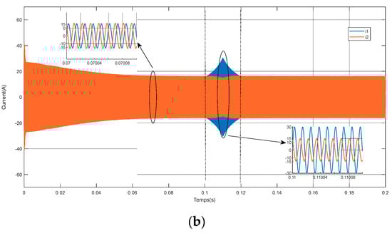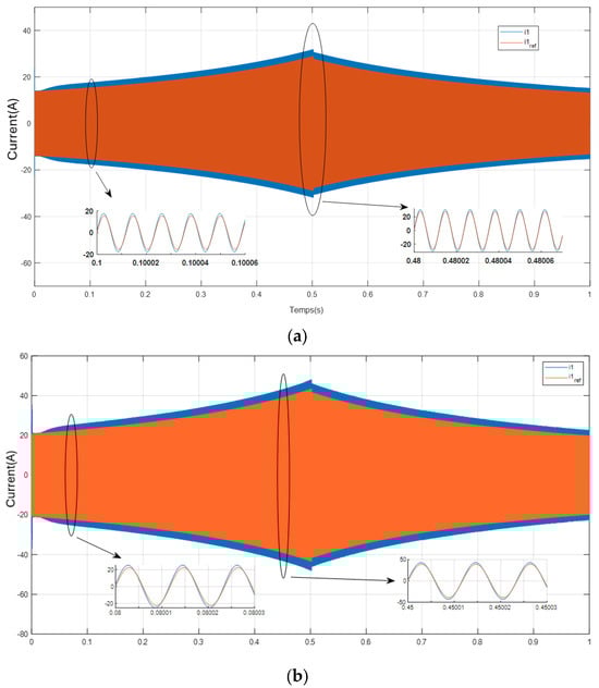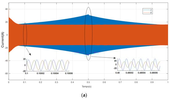 Finally, Figure 14a,b compare the actual current i1 with its setpoint i1_ref. The near-total overlap of the two curves over the entire analysis period highlights the very good performance of the current regulator, with good tracking of the reference setpoint.