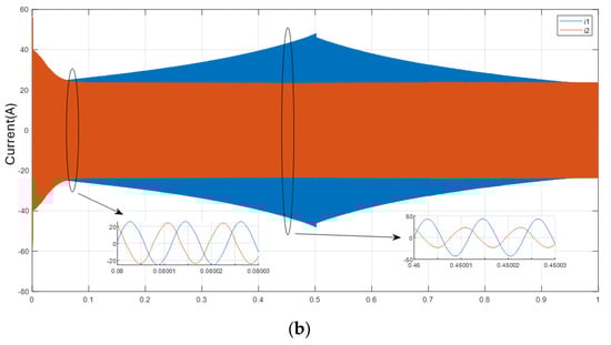 Figure 13a,b show the currents i1 and i2 flowing in the two system branches, respectively. These signals have a symmetrical sinusoidal shape, with an amplitude that increases progressively up to a maximum around t = 0.5 s for the primary current i1, then decreases due to the increase in the coupling coefficient as the receiver coil leaves coil tx1 and approaches coil tx2. On the other hand, the secondary current i2 remains virtually constant, even in the presence of receiver coil misalignment, particularly in the zone where the latter is located between two adjacent transmitter coils. This demonstrates that secondary power remains almost constant, as the variation in VL is minimal and i2 remains stable during the alignment and misalignment phases.