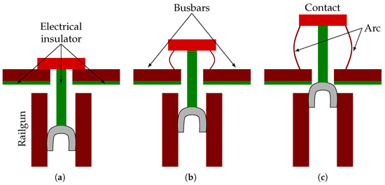 Figure 2 illustrates the operation of the railgun-based mechanical circuit breaker. During normal operation, current flows through the busbars and the closed contact. When a fault occurs, the railgun is fired, the armature starts moving, pushing the contact system and initiating an arc. The armature is mechanically connected to the contact through an electrical insulator, ensuring galvanic isolation between the main current path and the railgun system. As the armature progresses, the contact continues to open until it reaches the end of its stroke. Additional electrical insulators are placed beneath the busbars to prevent an unintended short circuit across the contact gap when the armature reaches its final position.