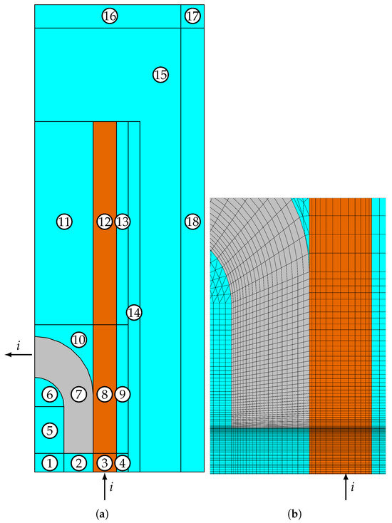 To represent the unbounded surrounding air and avoid artificial field reflections, the model is in infinite domains enclosed by infinite domains (see domains 16–18 in Figure 3. The physical width of the domain is given by the following expression: