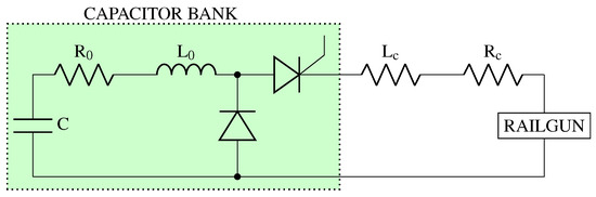 , , and denote the capacitor bank’s capacitance, resistance, and inductance, respectively. is the inductance of the connection between the capacitor bank and the railgun, while is the corresponding resistance of that connection. Table 3 lists the circuit parameters.