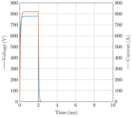 Figure 5 shows the load-side waveforms. The voltage is ramped to 800 and the current to 800 within . A hard short circuit is imposed at 2 ; thereafter, both voltage and current collapse to zero within 250 .
