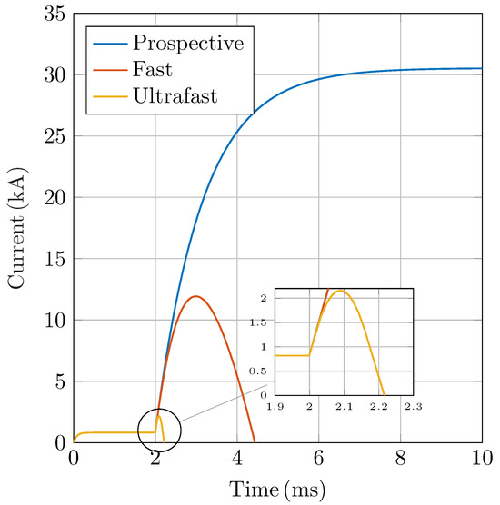 Figure 6 shows that a short circuit in the proposed system can reach a prospective current of 32 . A conventional fast breaker opening at 5 / limits the peak to 12 and interrupts in , whereas the proposed 100 / breaker limits it to 2200 and interrupts in just 200 , demonstrating the benefits of faster contact separation.