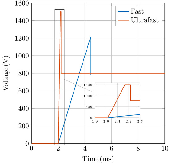 where is the arc voltage, is the average speed of the contact system, t is the time since the arc is initiated, and is a constant relating the arc voltage to its length. According to the experimental results reported in [20], arc voltages of up to 85 / can be achieved. However, to ensure a conservative estimation, a value of 50 / is assumed in this work. With a maximum stroke of 15 , this results in a maximum arc voltage of 1500 . The factor of 2 accounts for the simultaneous arcing on both sides of the contact, as depicted in Figure 2. Once the current crosses zero, the ideal circuit breaker opens, completing the current interruption process.
