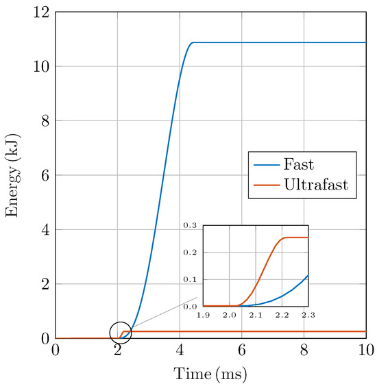 The proposed concept not only interrupts fault currents rapidly but also effectively limits them. By acting as a fault current limiter, it interrupts the current before it reaches damaging levels. A useful analogy is that of a snowball: stopping it at the top of the hill is far easier than after it has gained mass and speed rolling downhill. Similarly, the earlier the interruption, the less energy must be dissipated in the circuit breaker. It can be observed in Figure 8 that the ultrafast breaker absorbs only 250 , compared to 11 in the case of a fast breaker. As a result, the mechanical and thermal stress on the ultrafast breaker is significantly reduced. This not only minimizes damage to the contacts but also enhances the overall durability, reliability, and operational lifetime of the device.