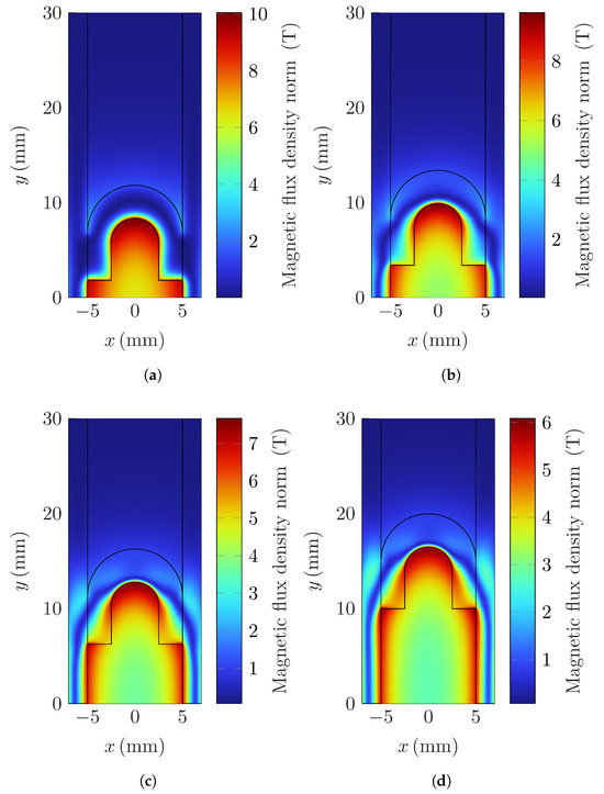 Magnetic field density norm at different time instants: (a) 25, (b) 50 , (c) 75, and (d) 100 .